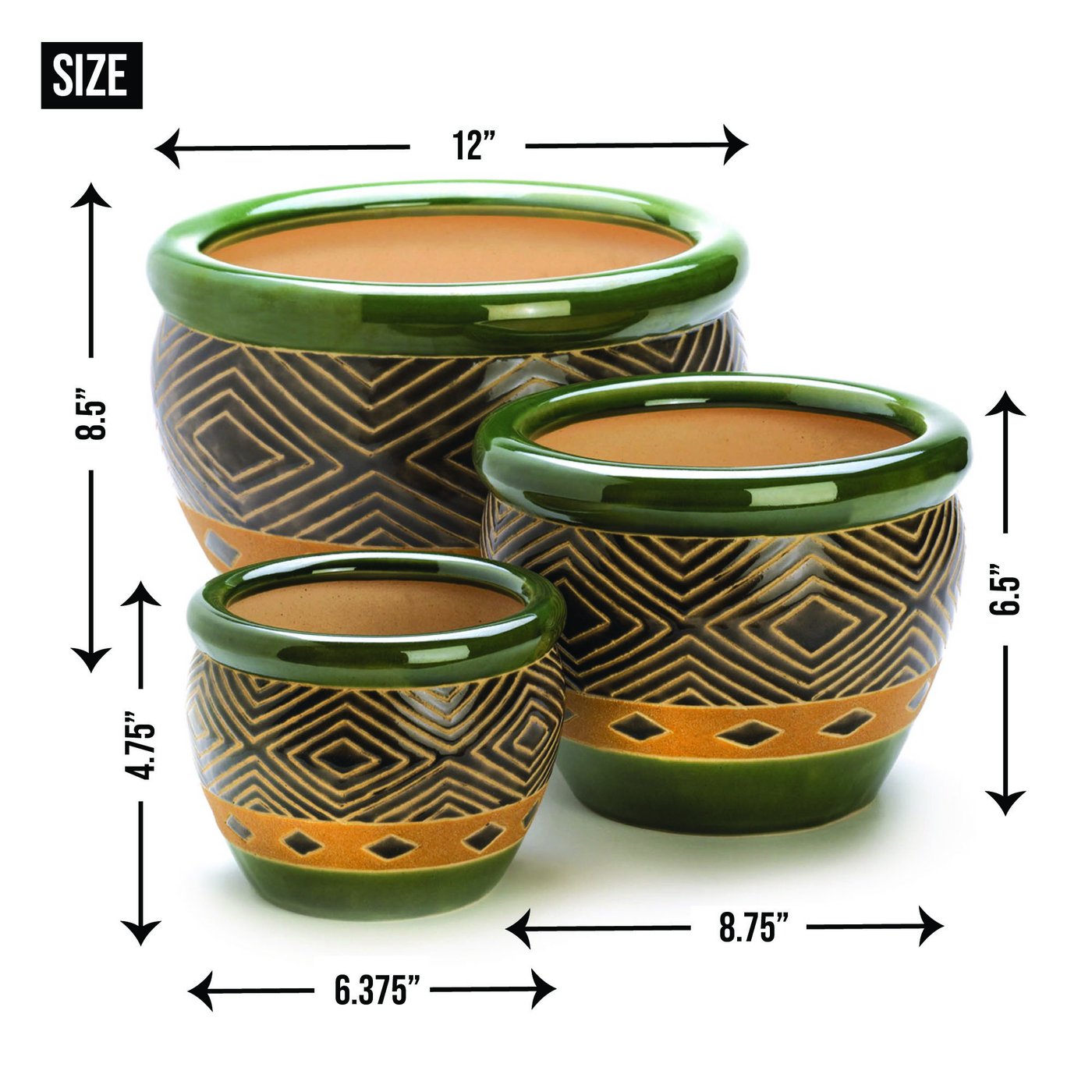 • The planter set weighs 13.2 lbs. and measures 12x12x8.5 inches for the largest pot.