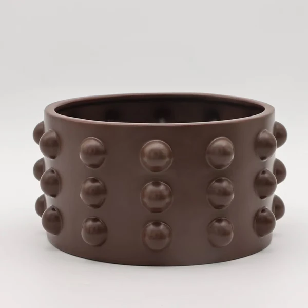 Elevate your space with this modern sculptural planter. Featuring a rich matte brown finish and a bold raised-dot texture, this planter blends contemporary design with playful character. The textured exterior adds depth and visual interest to any room. Ideal for plants, or as a standalone decorative piece, this planter brings warmth and style to shelves, desks, and tabletops.